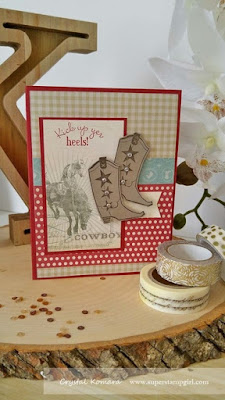 Crystal's card caught my eye at the beginning of the week.  I kept coming back to it and knew it was the one!  The mix of patterns, fancy cowboy boots, and polka dots made me smile!  This card made me want to boot scoot boogie to a country song.  CONGRATULATIONS Crystal,  YOU are my headliner this week!